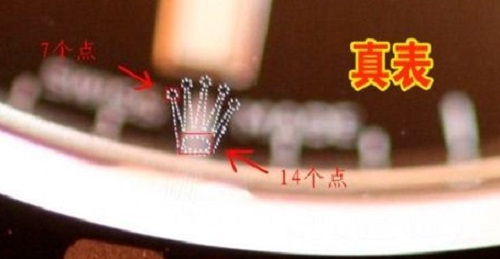 镭射标识是由激光点组成的劳力士的LOGO,也就是皇冠标,皇冠上方是5个圆环,每个圆环由7个激光点组成,圆环下方是火柴棍,每个火柴棍根据长短不同由8-10个激光点组成,下方是一个大的椭圆形,由14个激光点组成,底边的半圆由9个激光点组成,那么怎么能清楚的看到这个镭射标呢,如果你的劳力士是深色的盘面,那么只要是对着光线,注视着6点位,不停变换角度,就可以轻松的看到,但是对于浅色表盘,就要费劲的多,可能需要强光的帮助才可以,只要光线够足,从平面观察,也是很容易发现的,因为这个皇冠镭射标很小,只有大约1毫米大小,所以想看清楚它,最好还是用放大镜。