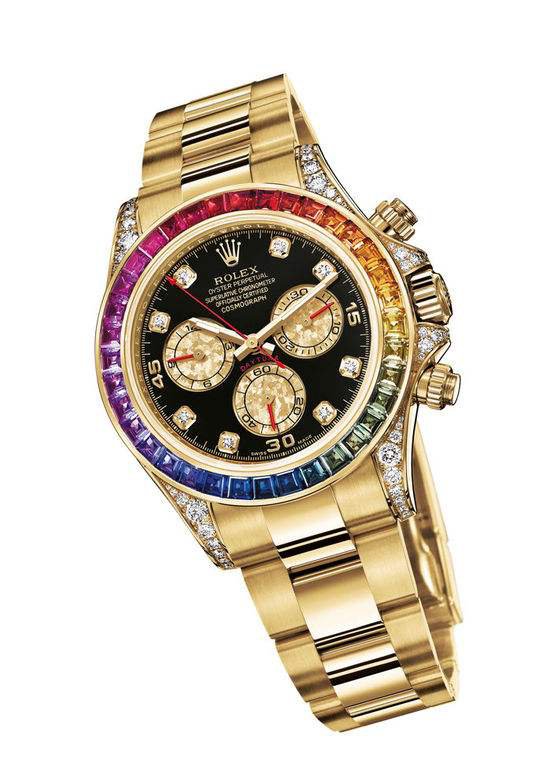 玫瑰金彩虹迪通拿,这款迪通拿可谓明星款式,表圈镶嵌宝石,刻度对应宝石,表耳镶嵌钻石,整体表壳玫瑰金打造,整表贵气逼人,其型号为116595RBOW,售价折合人民币62万